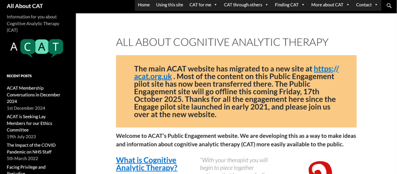 ACAT's Public Engagement Pilot Site emerged in early 2021 as ACAT was experimenting with ways to better fulfil our charitable aims to increase awareness and understanding of cognitive analytic therapy amongst health professionals, service providers, and particularly the public. The design and approach of that resource was developed in consultation with stakeholders, including people who had experienced CAT as a therapy. Two collaborative workshops were facilitated by Mark Brown, and workshop members gave us further feedback as the pilot site developed. Many CAT colleagues generously wrote and shared articles, images, and even animations, alongside content drafted by Alison Jenaway and Rhona Brown, who comprised ACAT's Public Engagement team at that time. We thank everyone who helped develop and update that public-facing resource.